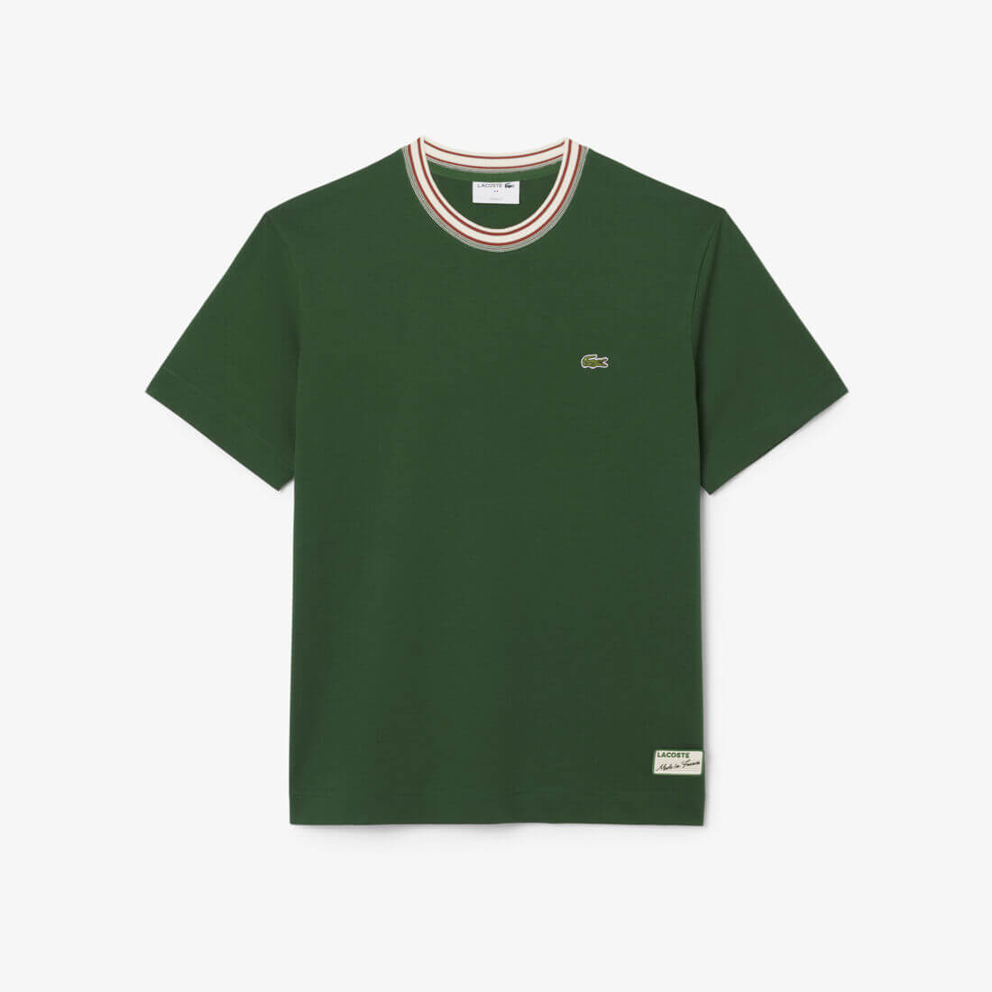This T-shirt is the fruit of 90 years of Lacoste elegance and knitwear expertise. Made in France from comfortable cotton jersey with a contrasting striped neckline, with knit detailing for added texture. A sophisticated piece, finished with a logo badge and embroidered signature crocodile.